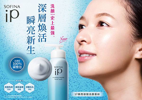 SOFINA iP瞬亮碳酸洗顏慕絲,結合連續5年銷售NO.1*1土台美容液的碳酸美容技術,堪稱SOFINA史上最強*2洗顏!內含100%*3高濃度*4碳酸*5微米泡,在豐盈綿密慕絲裡,擁有比毛孔還要小的碳酸氣泡,高密度滲透肌膚毛孔深處,溫和洗淨皮脂髒污與老廢角質,徹底潔淨帶走暗沉後,再深入兩頰加速帶動美肌循環力,每次洗淨都能感受從內到外所展現的紅潤透亮,彷彿洗臉也能瞬間一淨煥膚!含有持效透潤美容精華,可使臉部洗後肌膚不緊繃,保持細緻柔嫩,觸感平滑,質地溫和連敏感肌也適用。洗淨同時會聞到清新淡雅的海洋能量香氛,肌膚彷彿置身海流湧動、生生不息的美肌循環力之中,把洗臉變成極致的體驗享受,美麗由內至外煥發而出!