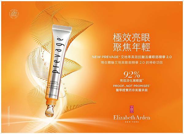 秉持品牌百年精神,以卓越科技提升PREVAGE抗老系列,將保養界超強抗老化成分艾地苯(Idebenone)運用至眼周保養,這次除了強大的抗老成份艾地苯,產品還添加5種逆齡成分,全方位改善眼周瑕疵,使眼周肌膚回春、綻放年輕迷人的光采。