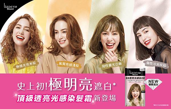 莉婕頂級透亮光感染髮霜一口氣推出四種遮白明亮時尚色「知性霧光亞麻」、「熱情光亮米棕」、「氣質亮感淺棕」、「個性冷光灰棕」,滿足妳對時尚風格的追求,盡情穿上與明亮髮色搭配的亮色系服裝,再次跟時尚造型說哈囉!心動的妳不如趕快到Liese莉婕官網來線上一鍵試色哦!(https://virtual-cosme.net/tw/liese/)