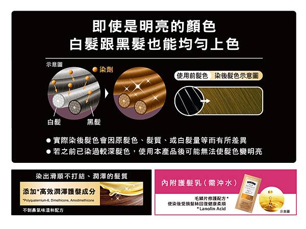 身為染髮時尚專家的莉婕,在染髮霜技術上是佼佼者,擁有獨特的調色技術,讓妳居家就可以自己染上沙龍級的質感明亮髮色,加強脫色力及上色力,不怕上色不均勻,造成會有色差的窘境,黑白髮都能完美上色。重點是明亮色調可以接續新生白髮,產生模糊無分界的錯覺,完美隱藏新生白髮。而且莉婕頂級透亮光感染髮霜有添加高效潤澤護髮成份還附有護髮乳,讓染後髮質保濕度、光澤度一次升級,在家透過簡單步驟就可以染上沙龍級的質感髮色。