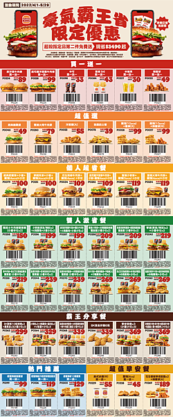 42款優惠組合激省賺$3000;4月1日起至5月29日,連續59天,祭出全新霸王分享餐,6款組合最高享近6折優惠;指定品項第二件享超殺免費送,最高現省$99。同時回歸超值人氣點心雞塊搭配薯條霸氣組合;個人超省餐只要$100起;同場再加碼12款雙人激省餐優惠組合,超值美味一次滿足,連假揪團吃堡最划算!