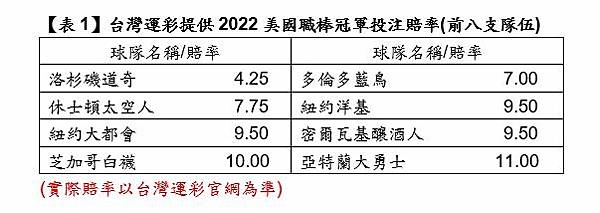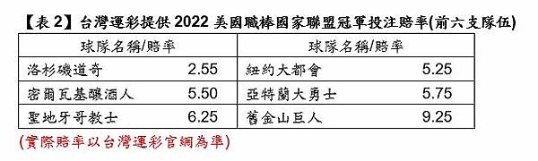 台灣運彩已提供的2022美國職棒各項「冠軍」投注包括「美國職棒冠軍」、「聯盟冠軍」與「分區冠軍」;去年的總冠軍亞特蘭大勇士在「美國職棒冠軍」投注中,賠率11.00倍、暫居第八,今年最具冠軍相是同樣來自國聯的洛杉磯道奇、賠率4.25倍,美聯被看好最有機會爭冠的隊伍是多倫多藍鳥、賠率7.00倍。消費者可趁著剛開季各隊賠率較偏高的時候投注「冠軍」玩法,隨著後續賽事的變化,季中可再來補強「冠軍」投注,提升冠軍投注的整體中獎機會。
