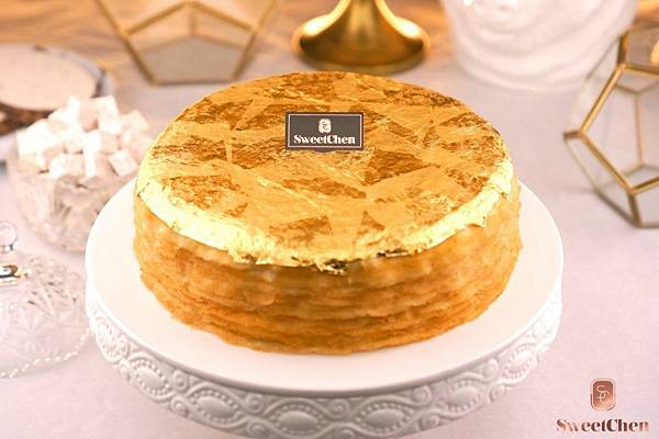 主推精品甜食的SWEET CHEN,希望透過純粹簡約的美味糕點,讓消費者品嘗與感受這些珍稀的原物料與食材所展現的無窮魅力。四葉芋頭金箔千層蛋糕每一層皆塗抹上濃郁的手工芋泥及北海道四葉鮮奶油,以18層餅皮堆疊而成,口感滑順與濕潤兼俱。表層貼滿食用金箔,是最奢華、最耀眼的一款。8吋建議售價2,780元,冷藏保存2~3天、冷凍保存3~10天。
