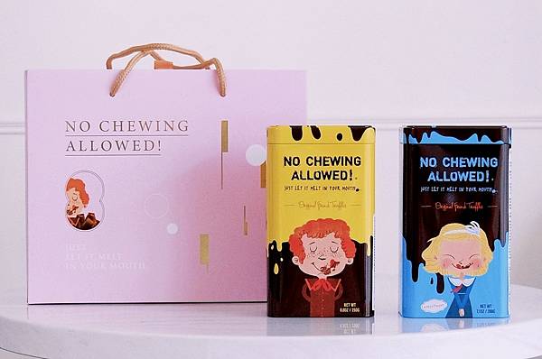 No Chewing Allowed!是紐約品牌的法國高品質松露巧克力,在紐約市中心設有專櫃,不需咀嚼就會入口即化還能融於手,全程從法國冷藏配送原裝進口。No Chewing Allowed!母親節限定午茶禮盒,經典黃鐵盒內含經典原味松露巧克力,綜合藍鐵盒(內含原味、榛果、覆盆莓、海鹽焦糖松露巧克力,嘗在嘴裡甜在心裡。建議售價1,850元。