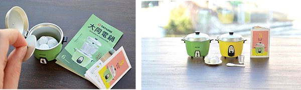 迷你大同電鍋盒玩全系列共有6款,包括台灣版2款經典色(紅、綠)及日本版4款顏色(綠、白、黃、水藍),每盒盒玩內皆附有大同電鍋本體,與內鍋、內鍋蓋、蒸盤、量杯,跟飯勺,所有內容物等比微型縮放。除此外每盒盒玩皆附有由日文及繁體中文編輯的迷你電鍋料理食譜書乙本,另還有“隨機“附送隱藏版LUCKY ITEM迷你肉包,整組神還原台灣人歷久不衰的廚房神器。
