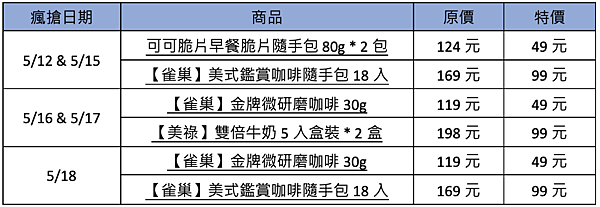 - 雀巢官方旗艦店限定最狂銅板價!整點瘋搶熱銷商品:5/12、5/15、5/16、5/17、5/18,每天0點上線即有機會用銅板價搶下雀巢熱銷商品!