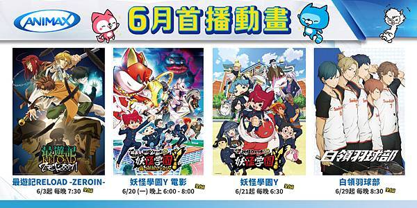 每逢6月驪歌起,進入鳳凰花開的季節,預告著令人依依不捨的畢業季即將到來!Animax頻道本月帶來多部精彩的首播及校園類動畫,其中除了最受矚目的妖怪手錶續作《妖怪學園Y》與《妖怪學園Y 電影》外,還有高糖分戀愛喜劇《堀與宮村》與溫暖感人的《魔法水果籃 最終季》等你一起收看,快跟著Animax頻道一起重溫校園生活! 此外Animax頻道更將額外帶來兩部全台電視首播動畫《最遊記 RELOAD -ZEROIN-》和《白領羽球部》,另《月光下的異世界之旅》與《東方少年》也將獻上中文配音首播,千萬別錯過!