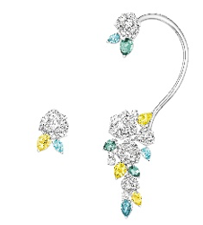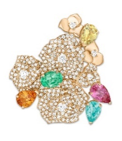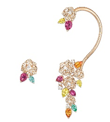 18K玫瑰金、鑲嵌288顆圓形切割美鑽,總重約2.40克拉、2顆梨形切割帕拉伊巴碧璽,總重約0.85克拉、4顆梨形切割粉紅碧璽,總重約3克拉、3顆梨形切割黃色綠柱石,總重約1.70克拉、2顆梨形切割錳鋁榴石,總重約2.10克拉。