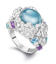 18K白金、鑲嵌單顆蛋面切割海水藍寶石,重約4.2克拉、2顆梨形切割帕拉伊巴碧璽,總重約0.44克拉、4顆梨形切割紫水晶,總重約0.56克拉、2顆梨形切割海水藍寶石,總重約0.32克拉、154顆圓形切割美鑽,總重約1.76克拉。