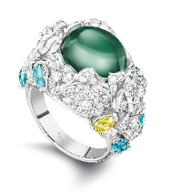 18K白金、鑲嵌單顆蛋面切割綠碧璽,重約4.2克拉、2顆梨形切割帕拉伊巴碧璽,總重約0.44克拉、4顆梨形藍碧璽,總重約0.60克拉、2顆梨形切割黃色藍寶石,總重約0.36克拉、154顆圓形切割美鑽,總重約1.76克拉。