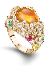 18K玫瑰金、鑲嵌單顆蛋面切割錳鋁石榴石,重約6克拉、2顆梨形切割帕拉伊巴碧璽,總重約0.45克拉、3顆梨形切割粉紅碧璽,總重約0.69克拉、2顆梨形切割黃色綠柱石,總重約0.36克拉、154顆圓形切割美鑽,總重約1.76克拉。