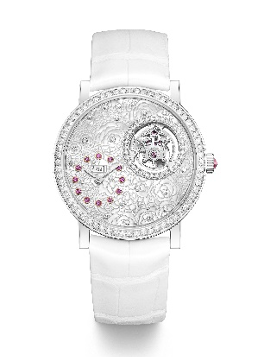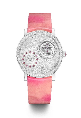 PIAGET Altiplano系列玫瑰雕刻超薄手動上鍊陀飛輪 粉紅藍寶石鑽石腕錶