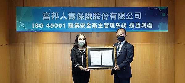 國際認證標準職業安全衛生管理系統ISO 45001目的在建立安全、健康的工作環境,使組織能夠鑑別和預防風險,減少員工發生事故和疾病的可能性,保護並提供員工一個安全可靠的工作場所,富邦人壽自2022年2月底導入ISO 45001職業安全衛生管理系統後,以系統化的方式優化及改進相作業流程,降低及避免職業傷害,歷時5個月即獲得認證。