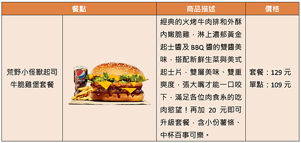 漢堡王「King Deals超省餐」系列迎來新力軍「荒野小怪獸起司牛脆雞堡」,即日起至10月31日限時上市,經典的火烤牛肉排和外酥內嫩脆雞,淋上濃郁黃金起士醬及BBQ醬的雙醬美味,搭配新鮮生菜與美式起士片,雙層美味、雙重爽度,張大嘴才能一口咬下,滿足各位肉食系的吃肉慾望!荒野小怪獸起司牛脆雞堡單點109元,再加20元即可升級套餐,含小份薯條、中杯百事可樂,乎你呷飽還能顧荷包!
