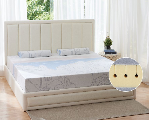 依據人體工程學計量,針對人體壓力分佈,設計圓溝槽式支撐結構,除提供優良的支撐性外,也針對肩、臀區加強曲線微調設計提升肩、臀兩區曲線支撐效果,同時圓溝槽式支撐設計能讓表面向下施壓時,氣體經壓縮,空氣由上往下,於圓溝槽隧道結構左右流出,產生床體內氣體流動,達到透氣通風 ,緩解悶熱。