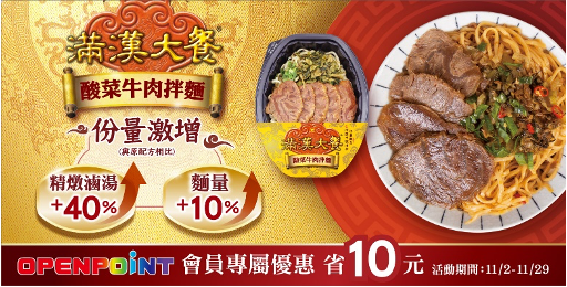 愛吃牛肉麵的你一定不能錯過這一款!在7-ELEVEN限定推出的滿漢大餐酸菜牛肉拌麵,份量激增升級版報你知!看準這款國民美食的超高人氣,首度針對風味和份量全方位升級,除了擔綱牛肉麵靈魂要角的酸菜,飽足感擔當的麵條增加10%份量超豪邁,精燉牛肉滷湯用量大幅提升40%賦予色香味,整體重量激增足足多了一成,重點是售價卻逆勢凍漲真的揪甘心,直接挑戰小七鮮食CP霸主寶座!即日起全新份量升級版在7-ELEVEN重磅上市,OPEN POINT會員在11/2-11/29期間兌換限量優惠券還可以再省10元,只要衝一趟超商就能吃得飽足又滿足,趕快手刀搶鮮體驗!