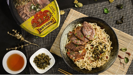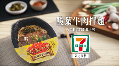 這款酸菜牛肉拌麵是超人氣泡麵品牌滿漢大餐跨界開發的鮮食,承襲滿漢大餐料豐味美的品牌基因,牛肉選用頂規牛前腱部位,經川燙、浸滷、燜燒三段工法讓牛腱肉更鮮嫩入味;而觀察到國人吃牛肉麵時常會加入酸菜自由調味的飲食習慣,研發團隊特別將經過與蒜頭直火爆炒的酸菜融入配方,再佐以牛油和熟成辣豆瓣醬,運用小巧思打造出道地國民經典風味,也讓這款鮮食自2020年推出後即擄獲大批消費者的味蕾,更廣受饕客好評。