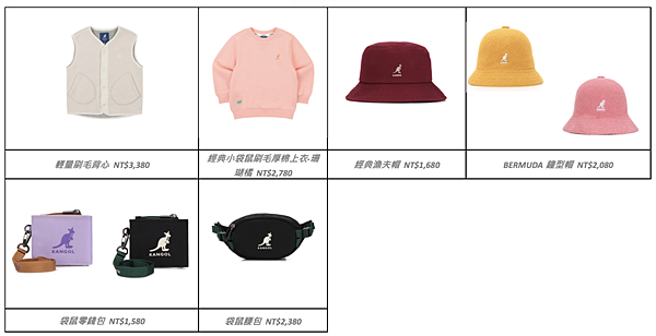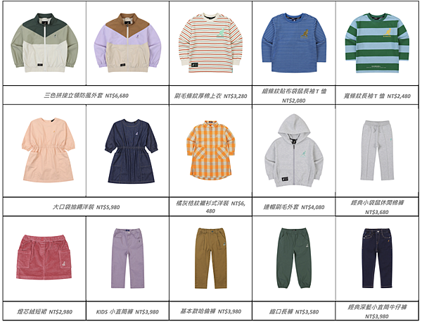 經典大袋鼠長袖T恤 NT$1,980 三色拼接立領防風外套 NT$6,680 縮口長褲 NT$3,580 袋鼠零錢包 NT$1,580 連帽刷毛外套 NT$4,080 經典小袋鼠休閒棉褲 NT$3,680 細條紋貼布袋鼠長袖T恤 NT$2,080 袋鼠腰包 NT$2,380 |