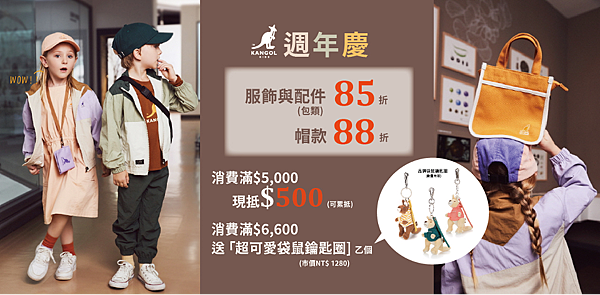 適逢週年慶檔期,KANGOL KIDS也特別祭出限定優惠活動,要替各位家長節省荷包隨心選購小孩的新衣!週年慶期間,新品服飾及包包全面85折、帽款88折,此外,單筆消費滿五千即可現抵五百,滿六千六再加贈品牌限量袋鼠鑰匙圈,贈品數量有限,贈完為止。歡迎爸爸媽媽們趁著週年慶優惠到KANGOL KIDS專賣店選購!