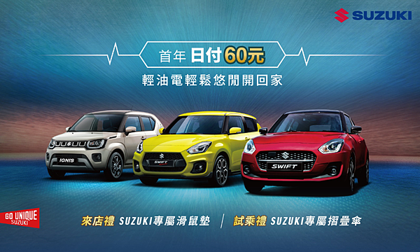 感謝TAIWAN SUZUKI廣大車迷的支持與熱愛,優惠持續大放送!11月即可輕鬆悠閒將SUZUKI各車款開回家,SWIFT車系、IGNIS「首年日付60元專案」、VITARA車款享「60萬30期0利率」、CARRY力挺頭家「分期免頭款,首年0負擔專案」等多種購車優惠方案,全車系領牌還可享『代車險』及『不限里程道路救援』!入主SUZUKI輕鬆悠遊,無後顧之憂!限時優惠錯過不再,歡迎至各大經銷展示中心賞車試乘。