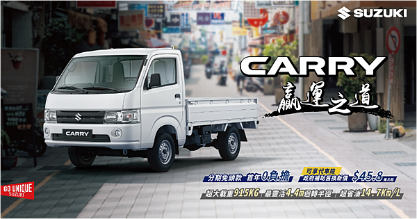 SUZUKI CARRY,以最全面的大貨台、大扭力、最低貨床離地高、最小迴轉半徑、優異節能油耗表現、全方位安全防護、鍍鋅底盤耐久品質…等,為每位內行頭家帶來「贏」運之道,現在還帶來更多優惠,力挺頭家!讓頭家贏在起跑點,分期免頭款,首年0負擔專案,可享『代車險』及『不限里程道路救援』,加上舊換新只要45.8萬起,可說是誠意滿滿、力挺頭家。搶先入主SUZUKI CARRY,百工百業的贏運之道,讓每個頭家不只是頭家,還是大贏家!