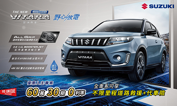 VITARA科技性能全面勁化,搭載新世代 48V HYBRID 輕油電科技及 1.4 L BOOSTERJET 缸內直噴渦輪增壓引擎,不只輸出 129.2 PS / 23.9 kgm 強悍動力,更以優異車身結構及輕量化設計,實現寧靜感及優越的油耗表現,S 車款更造就 19.3 km/L* 節能油耗。不只動能勁化,VITARA讓你玩更野!ALLGRIP 適時智慧型四輪傳動系統可依路況及喜好,在 AUTO / SPORT / SNOW / LOCK 四種行駛模式中自由變換,一路更有ACC主動式安全車距巡航控制、BSM 車側盲點偵測、DSBS 雙感知器煞車輔助等SUZUKI Safety Support 安全科技為你隨行守護,從主動到被動,提供駕乘者完善保護。VITARA獨樹一格的外型搭配傲人的越野性能及持續進化的安全科技,激發你對駕馭的渴望!