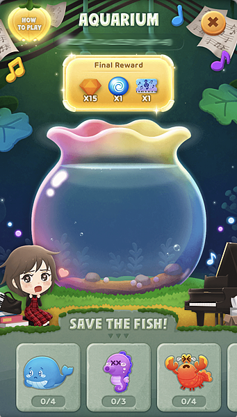 通過所有指定活動關卡並拯救被困住的海底夥伴們即可獲得獎勵!獲救的海底夥伴們會在活動頁面的水族箱中登場喔!詳細活動資訊請至遊戲內公告確認。