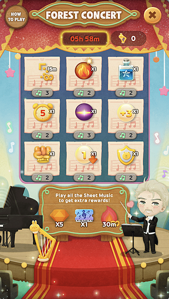 在活動期間內,只要通過一般關卡即可獲得樂器,使用獲得的樂器即可挑戰取得樂譜中的道具,成功挑戰後便可以獲得相對應的活動獎勵喔!