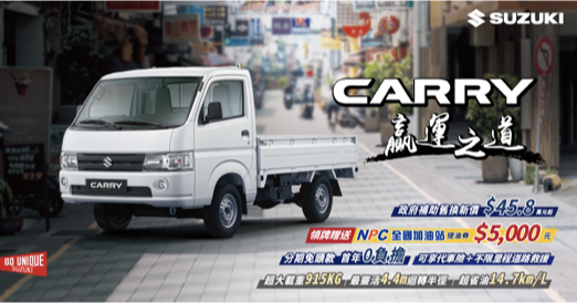 SUZUKI CARRY,以最全面的大貨台、大扭力、最低貨床離地高、最小迴轉半徑、優異節能油耗表現、全方位安全防護、鍍鋅底盤耐久品質…等,為每位內行頭家帶來「贏」運之道,現在還帶來更多優惠,力挺頭家!讓頭家贏在起跑點,12月底前領牌贈五千元提油券,分期免頭款,首年0負擔專案,可享『代車險』及『不限里程道路救援』,加上舊換新只要45.8萬起,可說是誠意滿滿、力挺頭家。搶先入主SUZUKI CARRY,百工百業的贏運之道,讓每個頭家不只是頭家,還是大贏家!