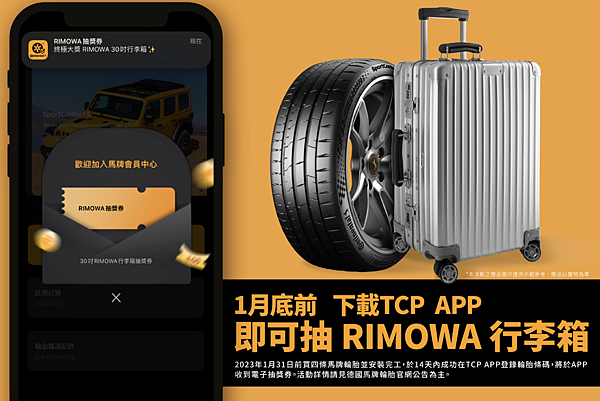 2023年1月底前下載「馬牌會員中心TCP APP」 加碼抽RIMOWA行李箱