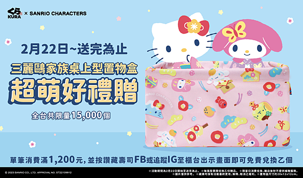 為了給大家的日常帶來好心情,藏壽司也將推出超萌好禮「三麗鷗家族桌上型置物盒」!盒上印滿日式開運圖樣的 Hello Kitty、美樂蒂、布丁狗以及大耳狗喜拿,充滿活潑的繽紛色彩又超級實用!只要消費滿1,200元 並按讚藏壽司Facebook或追蹤藏壽司官方Instagram,至櫃台時出示畫面即可兌換。全台限量 15,000 個,數量有限換完為止,還不快跟朋友相約藏壽司用餐!