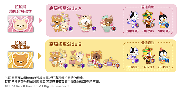 「拉拉熊」、「小白熊」、「小黃雞」和「茶小熊」化身限定寵物在高級扭蛋中登場囉!本次的高級扭蛋中將包含2種扭蛋,透過遊戲中各種活動獲得的「拉拉熊粉紅色扭蛋券」可於「高級扭蛋Side A」試手氣,「拉拉熊黃色扭蛋券」則可於「高級扭蛋Side B」試手氣,2種扭蛋內含的限定寵物將有所不同。獲得獎勵的條件等詳細資訊請至遊戲內確認。快來把握機會讓『拉拉熊』角色們成為你的過關夥伴,一起在《LINE Bubble 2》中闖關吧!