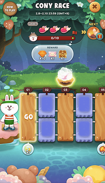 在活動期間內,玩家逐一通過關卡即可渡過橋板讓兔兔往前進,但挑戰關卡失敗的話會失去1隻「鞋子」。失去所有鞋子便會返回該階段的起點重新開始,順利通過所有關卡就能獲得獎勵喔!