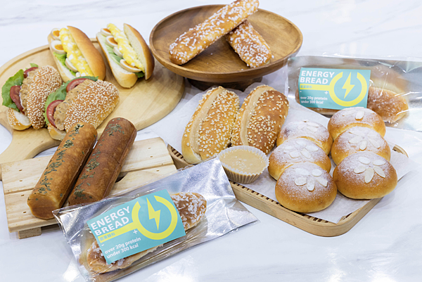 每份20g蛋白質含量的「ENERGY BREAD能量麵包」共有原味堡體加上三鹹三甜餡料口味,包括有、牛奶乳酪、雞蛋沙拉、哇沙米鮪魚、卡士達、白醬燻雞及花生麵包。