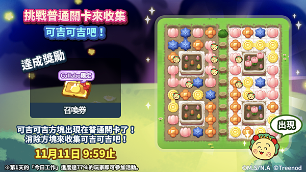 合作活動期間內,普通關卡內將出現「可吉可吉方塊」,成功消除並通過關卡就能收集「可吉可吉方塊」,多多收集來獲得合作限定召喚券獎勵吧!