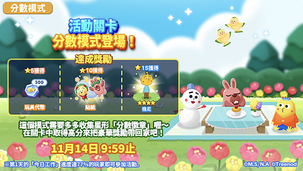 合作活動期間內,遊戲內也將推出「可吉可吉」合作分數模式關卡活動,努力蒐集星形「分數徽章」來把豪華獎勵帶回家吧!