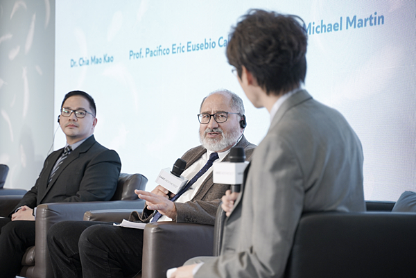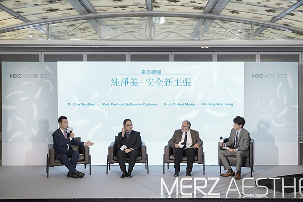今日記者會中進行肉毒桿菌抗藥性論壇,由曾繁聞醫師(右1)主持,與會高嘉懋醫師(左1)、德國免疫學專家Prof Michael Martin(右2)、菲律賓醫學教授Prof. Pacifico Eusebio Calderon MD(左2)