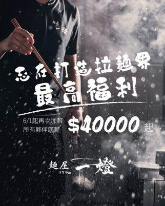 單就薪資面,2023年2月時,麵屋一燈已提升過一次正職底薪,今年6月、再接再勵、決定將好業績分潤給所有一同打拼的員工、再次替加薪到4萬元起,且營業額開紅盤時,也會直接將紅利回饋給員工,希望公司好、夥伴生活也要更好!從此打破餐飲業低薪的產業現況!