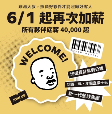 網友們最關心的薪資問題在官方社群更是直接公開 --- 無經驗正職照樣直接起薪$40,000up!劍指鼎泰豐,讓許多社會新鮮人、轉職者、及有心加入餐飲的人注入一劑強心針!雞湯大叔目標是從此改善餐飲就業環境,讓餐飲從業人員,不再與低薪畫上等號,並掀起餐飲薪資革命。