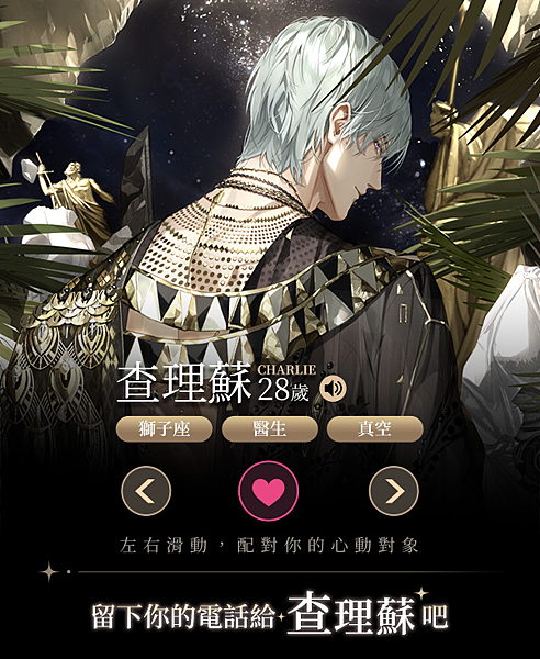 玩家將扮演一名新星時尚設計師,置身於東方都市背景下,與酷帥有型的職業賽車手、溫柔優雅的集團CEO、傲嬌毒舌的頂級設計師、充滿自信魅力的醫生以及陽光開朗的音樂劇演員等不同風格的男主角交織出一場超越現實的沉浸式戀愛體驗,帶領玩家一起探索時尚與愛情的極致魅力。遊戲中逼真的電話和視訊互動使男主們更加栩栩如生,精緻的約會場景和精心打造的劇情,加上臉紅心跳的耳語呢喃,共同營造出一場難忘的感官盛宴,讓玩家每日每夜都能感受到男主角們的心跳。