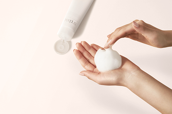 2. 沾濕臉部,取適量於手,用少量清水或溫水充分搓揉起泡後包覆全臉般清潔,再徹底沖淨即可。
