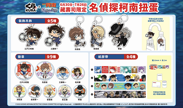 文具控也先別急著灰心!藏壽司也貼心推出4款不同風格的原創柯南紙膠帶。不管是美式漫畫風格,或是集結各角色陣營的款式,都可以黏貼在筆記本、杯子,甚至可以用作小物件的裝飾,讓柯南陪伴各位藏友們的日常!藏壽司X柯南聯名扭蛋從6月30日起開始到7月26日推出一個月時間,絕對能讓藏友們蒐集全套扭蛋,現在就趕快前往離你最近的藏壽司用餐吧!