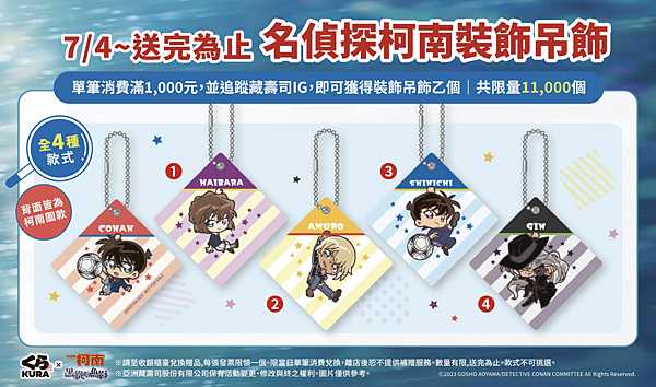 除了經典18款柯南扭蛋之外,喜歡柯南的藏友們有福了! 自7月4日起,只要在藏壽司店裡消費滿1000元,並參與藏壽司社群活動,就能免費獲得藏壽司限定「柯南裝飾吊飾」 !背面皆為柯南的可愛圖樣,吊飾正面則推出共4款不同角色造型,等著藏友來蒐集!全台限量11,000個等著藏友來換。數量有限,換完為止!
