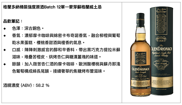 於酒體加入一兩滴水,就能充分展現威士忌的真實特性,開展豐富精彩的風味層次,感受從 濃郁摩卡咖啡,到葡萄乾水果蛋糕與奢華烤布蕾的香氣變化。此種令人讚賞的表現,源自於 第 12 批次的格蘭多納桶裝強度原酒,由於全程在高級的Pedro Ximénez 與 Oloroso 雪莉 桶中熟陳,才得以造就出蘊含濃醇雪莉桶風味的高地單一麥芽威士忌 。