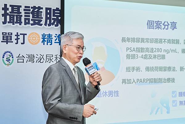 黃逸修醫師也分享一名逾70歲的導遊,平日排尿無異常身體也無恙,直到四年前第一次體檢觀察到PAS指數異常高,才前往泌尿科就醫檢查,確診當時已是轉移性攝護腺癌,該名導遊在接受去勢療法、新一代荷爾蒙療法及化療後,仍觀察到疾病持續惡化,由於基因檢測結果顯示為BRCA突變基因,因此為其安排單一PARP抑制劑治療,雖然初期有出現輕微貧血狀況,所幸在輸血後症狀即改善,治療半年PSA指數下降外,亦無觀察到其他嚴重副作用。對於晚期病友PARP抑制劑還能達到如此不錯的治療成效,黃逸修醫師表示實屬欣慰,同時也說明考量未來疾病發展的不確定性,還是會建議病友先進行基因檢測,若是BRCA突變基因者則可單獨接受PARP抑制劑治療,除了有較少的副作用外,也可以減輕病友的經濟負擔。