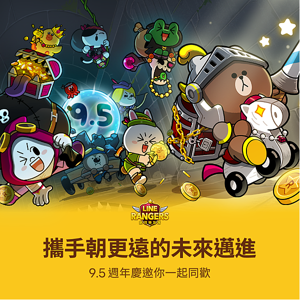 LINE GAME旗下塔防遊戲《LINE Rangers 銀河特攻隊》自服務開始,於2023年8月28日(一)上線滿9.5週年!感謝各位玩家一直以來的支持與陪伴,為了紀念這個特別的日子,今天起展開「9.5週年紀念活動」,快來一同歡慶拿好禮!