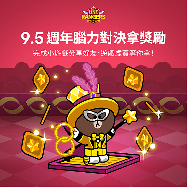 參加LINE GAME官方帳號舉辦《9.5週年翻牌小遊戲》!快來跟好友比較誰的記憶力更好!活動期間內每日進行《9.5週年翻牌小遊戲》挑戰並分享給好友,即可獲得限量遊戲虛寶,天天玩遊戲最高可以獲得扭蛋券10張!