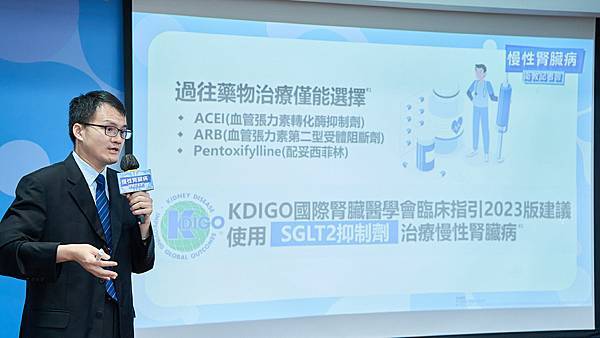 台灣腎臟醫學會理事長吳麥斯表示,慢性腎臟病因初期症狀不明顯,近6成被診斷時已是晚期(3-5期)[1],此時腎功能已受損且不可逆;腎功能下降恐讓病人加速面臨住院、洗腎、死亡等問題。過去用於治療慢性腎臟病的藥物,如血管張力素轉化酶抑制劑(ACEI)、血管張力素第二型受體阻斷劑(ARB)或配妥西菲林(Pentoxifylline)等藥物,對於延緩腎功能下降仍有侷限,值得慶幸的是,目前SGLT2抑制劑可以幫助延緩腎功能下降,進一步降低住院、洗腎或死亡的風險,有望破除台灣洗腎王國別名,達到慢性腎臟病照護的願景。