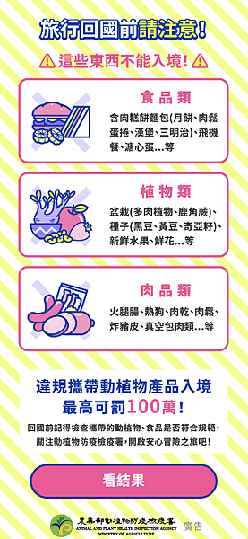 防檢署提醒民眾,出國旅遊固然開心,但遵守入境檢疫規範保護我國的動植物,也是身為好國民應盡的責任喔!千萬別因為一時的疏忽而造成損失,違規攜帶動植物產品入境最高可罰100萬元!如不清楚相關規定,可以到動植物防疫檢疫署官網、Facebook、Instagram或LINE官方帳號查詢。