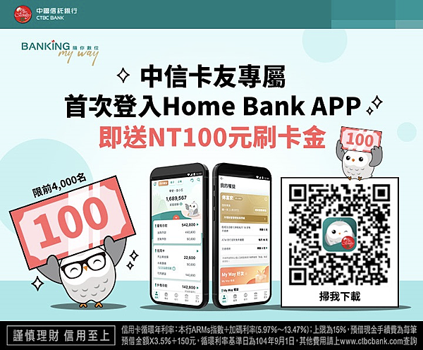 中國信託商業銀行(以下簡稱「中信銀」)的「Home Bank APP」自上線以來,客戶數超過五百萬人,不僅積極發展創新功能,現在更祭出卡友專屬優惠活動,即日起至今(112)年 10 月 31 日止,凡擁有中信信用卡的卡友,於活動期間內首次登入中信Home Bank APP(需至APP內登錄,限前4,000名),即享NT100元刷卡金回饋,邀請卡友體驗Home Bank APP的便利,勢必成為卡友絕佳工具選擇。